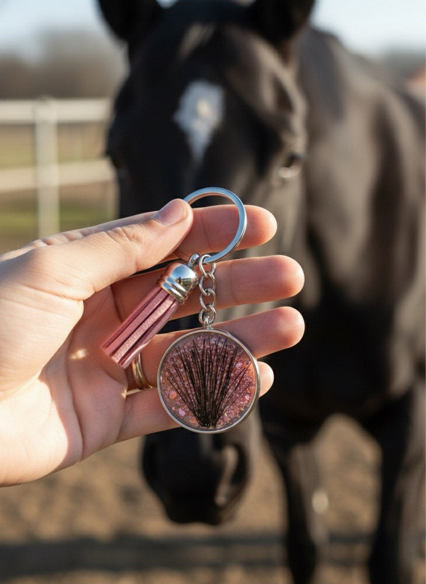 Ce porte-clés élégant est conçu pour abriter un précieux souvenir : une mèche de cheveux, de crins ou de poils. Sa forme d'éventail, rehaussée de paillettes scintillantes en fond, en fait un objet unique. Personnalisez le entièrement en choisissant la couleur de paillettes qui reflète votre style.